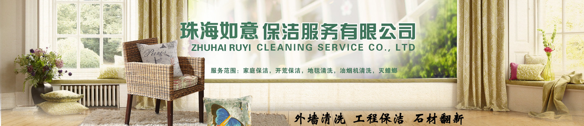 珠海市如意清潔主營(yíng):外墻清洗、地毯清洗、石材護(hù)理翻新、企業(yè)保潔、開荒清潔、屋面防水、油煙管道清洗。家庭保潔,物業(yè)保潔,小區(qū)物業(yè)保潔,樓盤開荒,沙發(fā)清潔,地板打蠟,(建筑、汽車玻璃貼膜)。